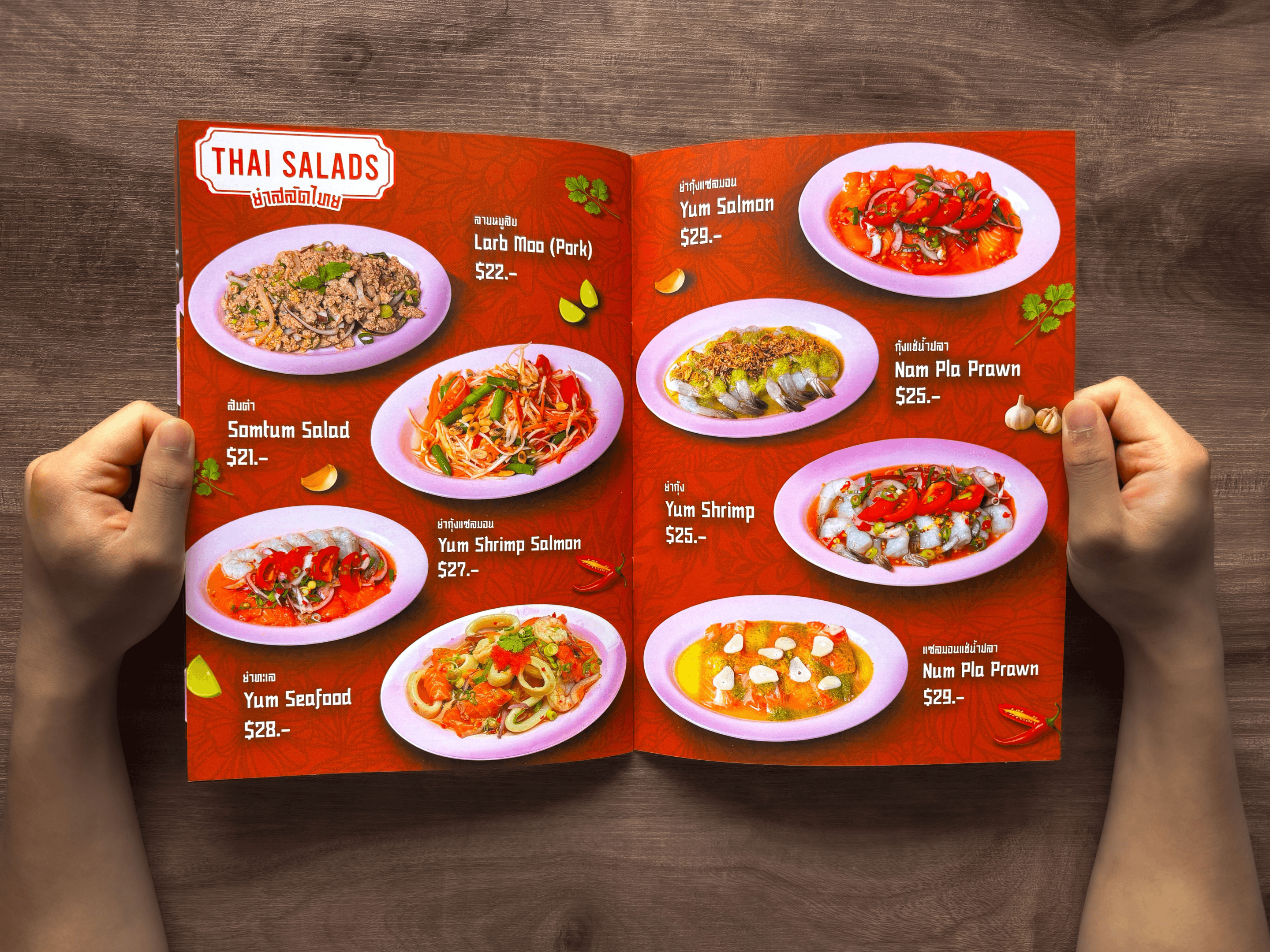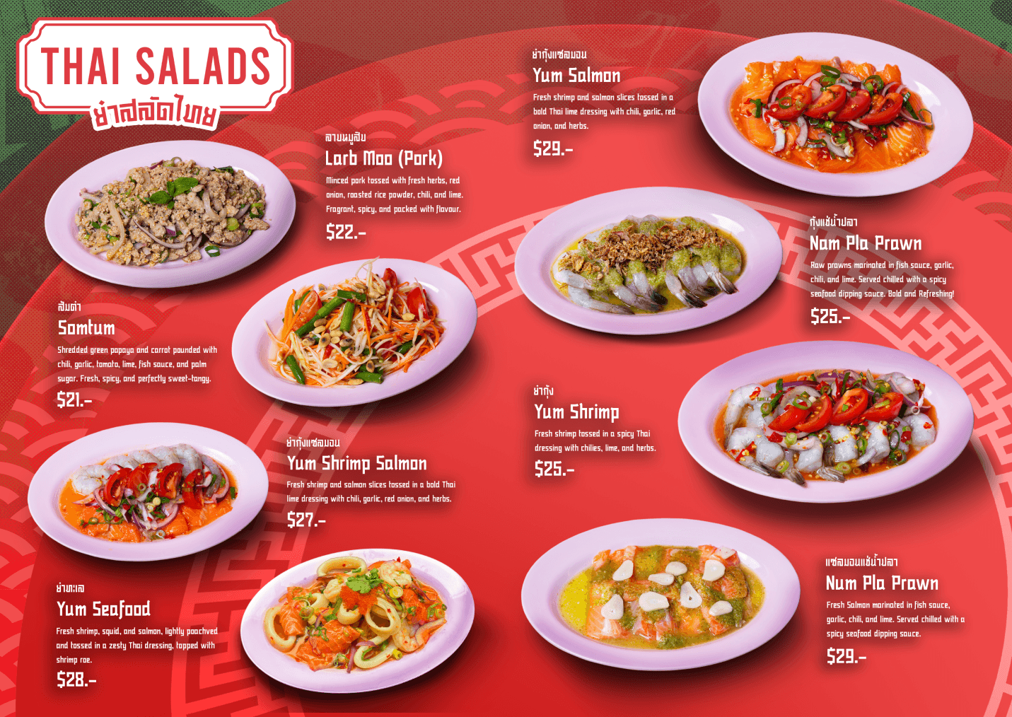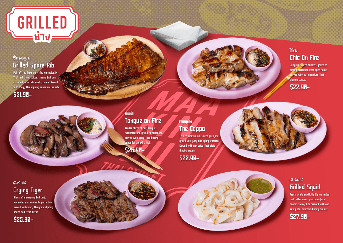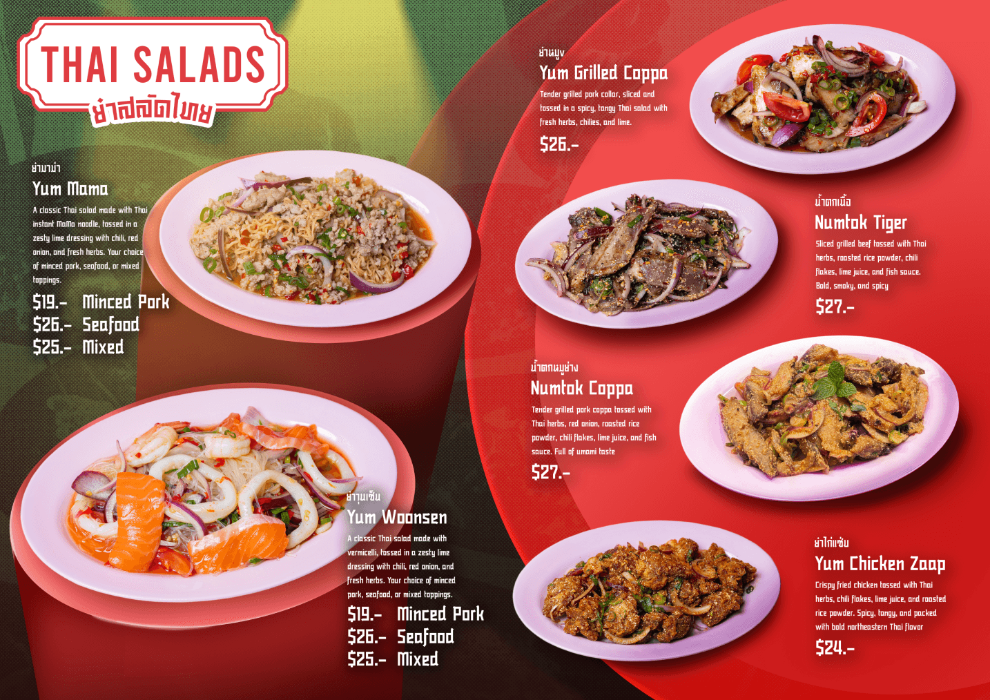 The first menu concept was designed as a double-page A4 layout, using food images provided by Maakindii to replicate a traditional Thai restaurant menu. The layout was handcrafted in Adobe Photoshop with royalty-free assets, but the result lacked strong visual impact and brand alignment + overwhelming amount of text