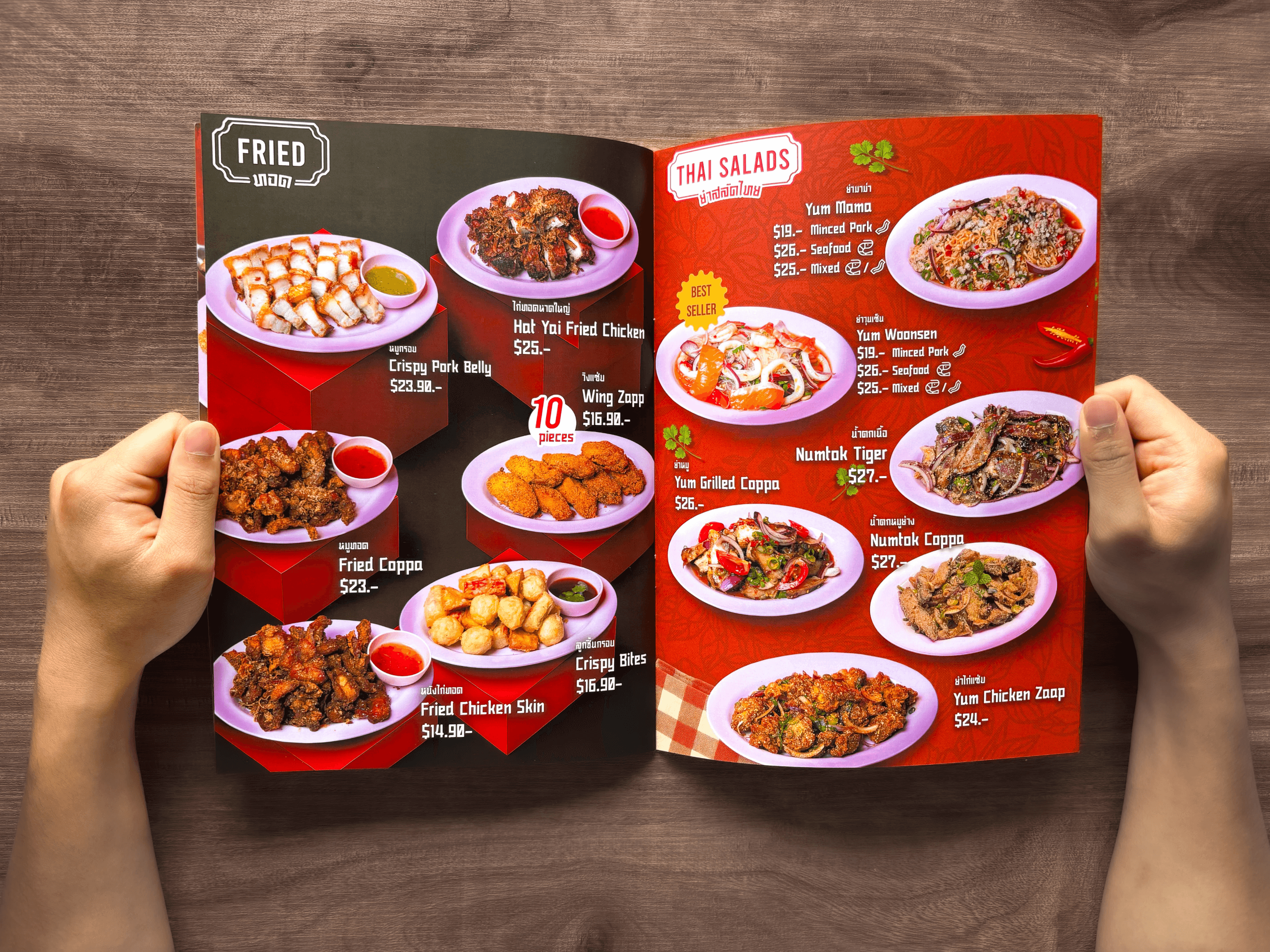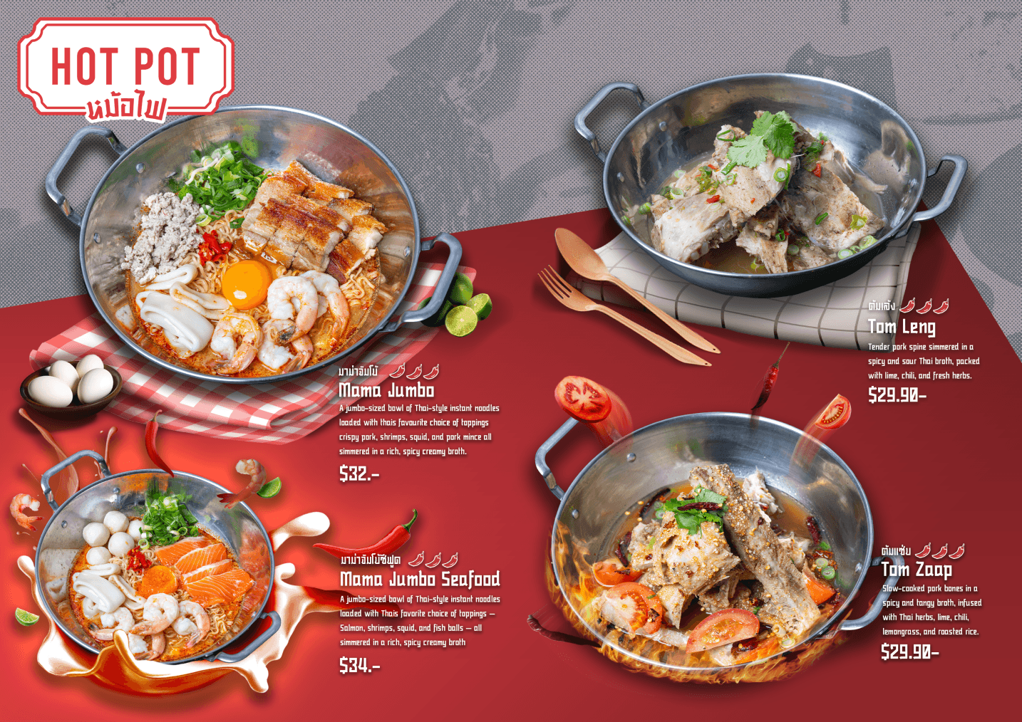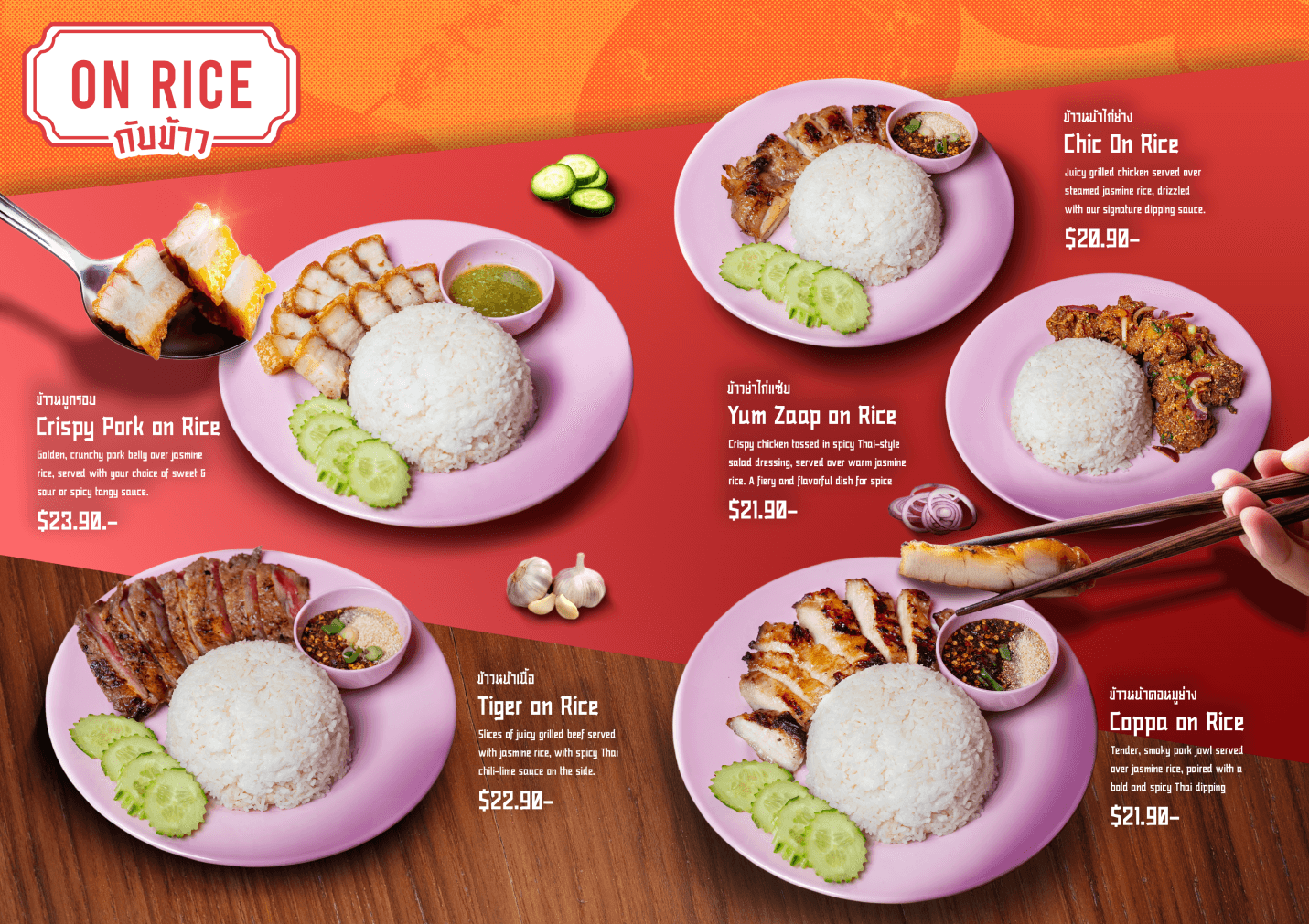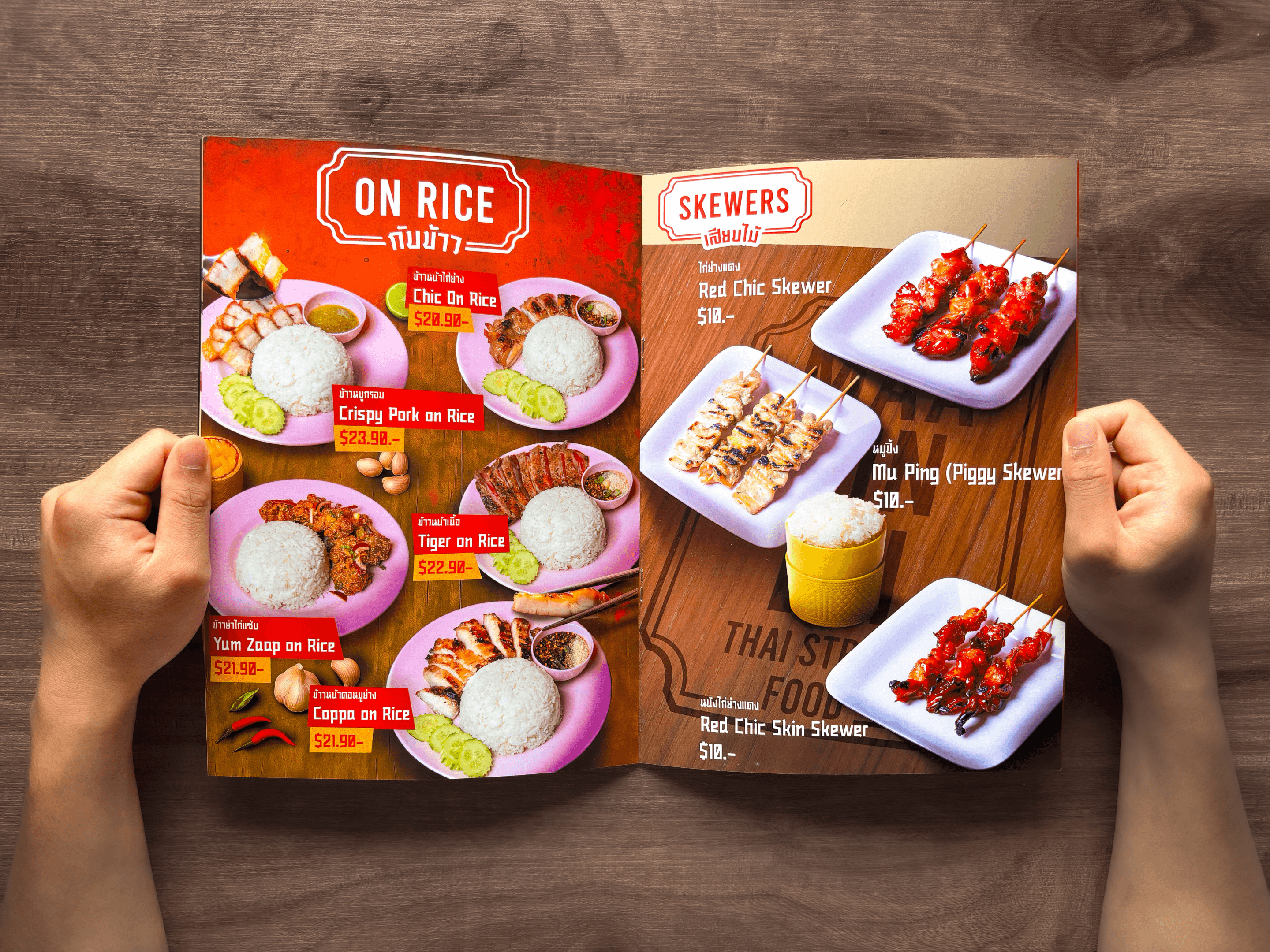 The first menu concept was designed as a double-page A4 layout, using food images provided by Maakindii to replicate a traditional Thai restaurant menu. The layout was handcrafted in Adobe Photoshop with royalty-free assets, but the result lacked strong visual impact and brand alignment + overwhelming amount of text