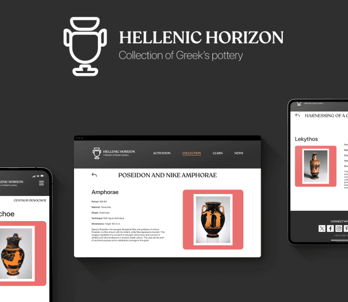 a digital archive showcasing over 60 Greek pottery pieces and animated activations that bring the ancient scenes to life. The site is fully responsive across desktop, tablet, and mobile.
